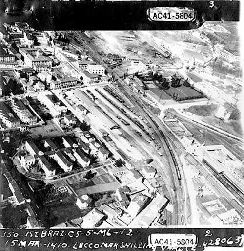 The Lecco’s marshalling yard, Lombardia, Northern Italy, under attack of 1st Grupo de Caça of Brazilian Air Force, 15 March 1945. Photo taken by Thunderbolt aircraft C5 during the Mission 275. Victor Sierra