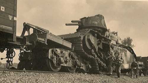 A french tank wreck beeing departed by german soldiers. Maybe they are going to recycle it or use it for target practice.