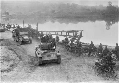 Hungarian 38.M Toldi I light tanks and a German made Krupp Protze artillery truck cross a river on the Eastern Front. On the right are Hungarian soldiers with bicycles.