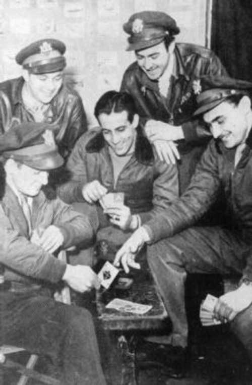 Lt. Col. Duane Beeson, CO, 334th FS; Capt. Nick "Cowboy" Megura; 1st Lt. John T. Godfrey; Maj. James A. Goodson, CO, 336th FS; (center) Capt. Don Gentile. Between them, they scored over 100 victories.